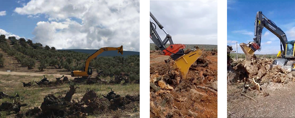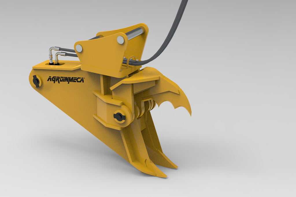 Cizalla hidráulica industrial con gran capacidad de corte y despiece de troncos y ramas de olivo de forma segura, rápida y eficaz.